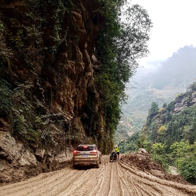 A short time later we are stopped by the driver of a huge lorry. He pulls his truck to the side of the road, (if we are game enough to call it that) and scurries over. No. He clearly indicates to us. You cannot keep going. Using an English translation app he finally outlines to us the situation ahead. And in no uncertain terms. Turn around. Go back. In as much as we could surmise, the roadworks continued in this fashion for another 50 to 80-kilometers. With 1000m to climb and a pace of 3-km/hr, it was no use. We finally did what we should have done much earlier. We turned back, sliding our way back downhill, past the knowing nods and smiles of all those who had tried to warn us.
